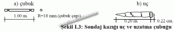 3. Sondalama yapmak: Küçük alanlar üzerinde çapı 2–4 cm. uzunluğu 3–5 m. olan “Deney Mili” ile sondalama yapılır. Mil zemine batırılır her 5 vuruşta bir milin zemine batma miktarları ölçülüp bir grafiğe işlenir. Böylece zeminin dayanımı hakkında ve mil ucuna yapışan zemin parçacıklarına bakılarak tabakalar hakkında fikir edinilir. Daha iyi bir sondalama işlemi de yaklaşık10 m. uzunluğundaki uzatma çubuklarına 2 m.lik sonda ucu takılıp çevirmek suretiyle zemine sokulması şeklinde uygulanan “Sondalama Aleti” kullanılmaktır (Bkz. Şekil)