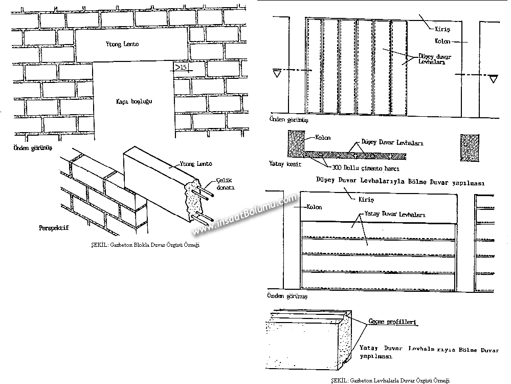 Gazbeton Duvarlar: Kuvarsit, alüminyum tozu, çimento ve suyun karıştırılıp kalıplanması, önce doğada kurutulması, sonra da yüksek basınçlı buharda sertleştirilmesi yoluyla imal edilen gazbeton duvarlar alışılmış marka ismiyle “YTONG” ile de anılmaktadır. Donatısız ya da demir donatılı olarak yapılabilen gazbetonlar ayni alçı duvarların özelliklerine sahiptirler; ses ve ısıya karşı yalıtımları daha iyidir (Şekil VI.33.).