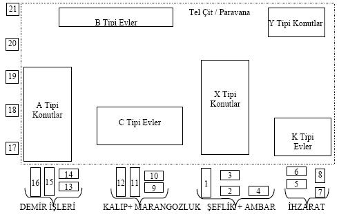 Bu tip inşaatlarda binaların kapı, pencere, parmaklık, çatı, döşeme, merdiven v.s.leri standardize edilmiş olduğundan bunlar için toplu yapım tesisleri kurulur. Bu şekilde ekonomi sağlanmış olur. Bu binalardaki beton işlerini de ekonomik olarak yapmak ve iyi bir kontrol sağlamak için bir beton yapım merkezi kurulur ve yapılan beton binalara hazır olarak iletilir. Bu beton yapım merkezi, çimento ambarı, kum ve çakıl depoları, betoniyer tesisleri ve biriket-tuğla yığınlarıyla bir araya toplanarak kombine bir işletme üntesi şeklinde kurulur. Sonra kereste ambarı, iskele-kalıp atölyesi de buna eklenerek ikinci bir işletme ünitesi elde edilir. Üçüncü işletme ünitesi ise malzeme ambarı, demir ambarı, demir bükme ve hazırlama atölyesinden oluşur. Dördüncü ünite garaj, taşıt parkı, demir atölyesi ile oluşturulur. Şantiye şefi, büro binası, ufak makine ve alet ambarı bir arada bulunur. Şantiye içi taşıma işlerinde damper ya da kamyonet kullanılır. Bu tip şantiyelerde, şehre yakınlığından dolayı genellikle elektrik enerjisi kullanılır.